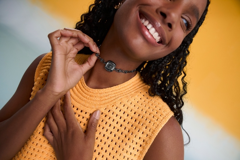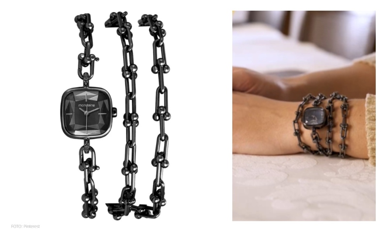 O segredo para tanto sucesso? Está na pulseira do modelo, que aparece em formato de corrente. Uma vez em ação, o item pode ser utilizado da forma tradicional, no pulso; ou então, no pescoço, como uma choker.