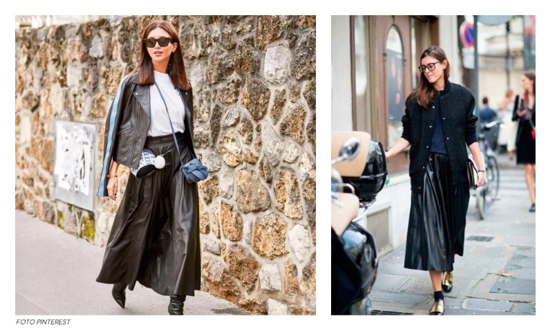 Para começar, que tal um modelo de saia para Inverno extremamente sofisticado? Aqui, destacamos as versões de comprimento midi, confeccionadas a partir de couro ecológico e com acabamento plissado.