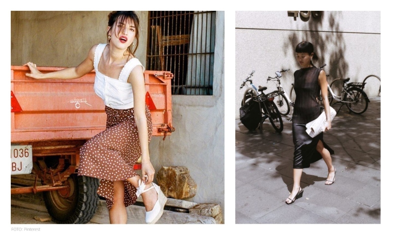 as minimalistas: sandálias com salto anabela, mas que apresentam tiras fininhas. Em muitos casos, essas opções ainda são pautadas por tons neutros, como o preto, o nude e o off-white;